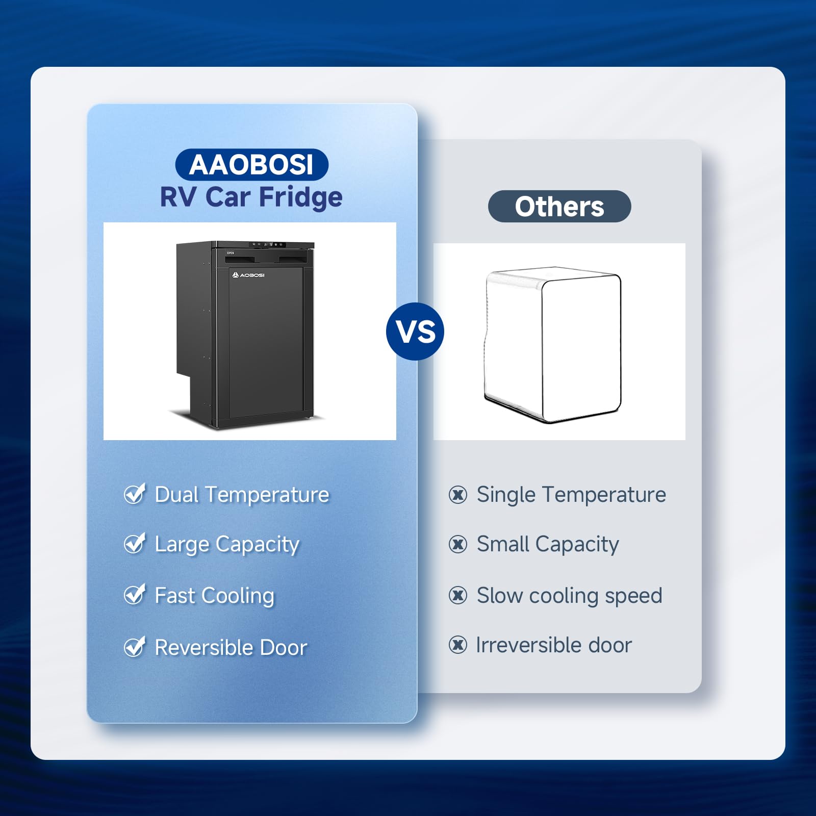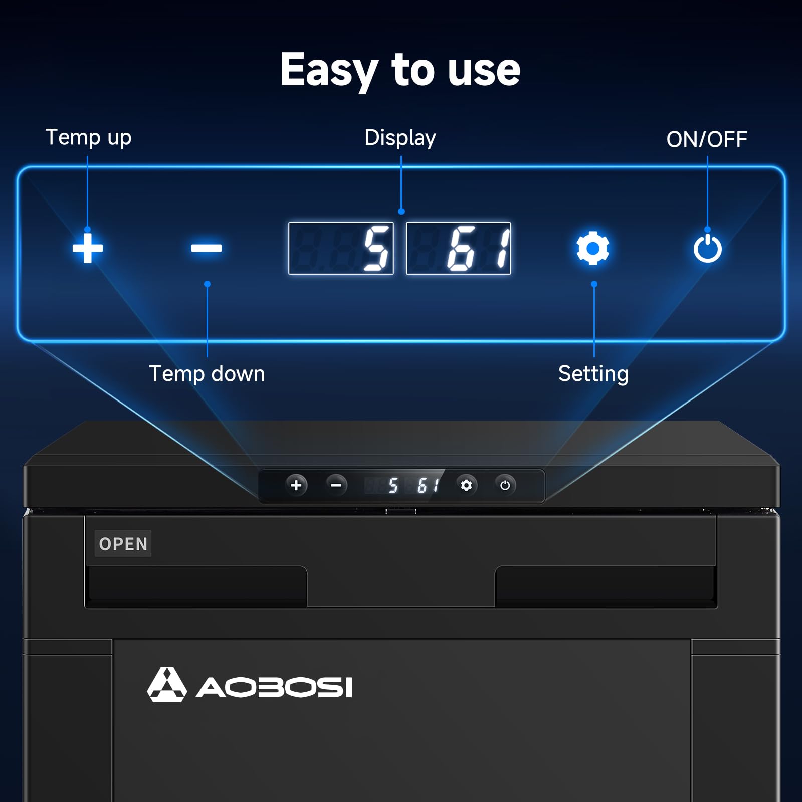 - Low Noise: Less than 45dB low noise design provides a silent and comfortable environment for you when it is running. AAOBOSI car fridge is equipped with 12/24V DC, which can be used on various vehicles, such as SUV, Truck, RV, Camper, Van, etc