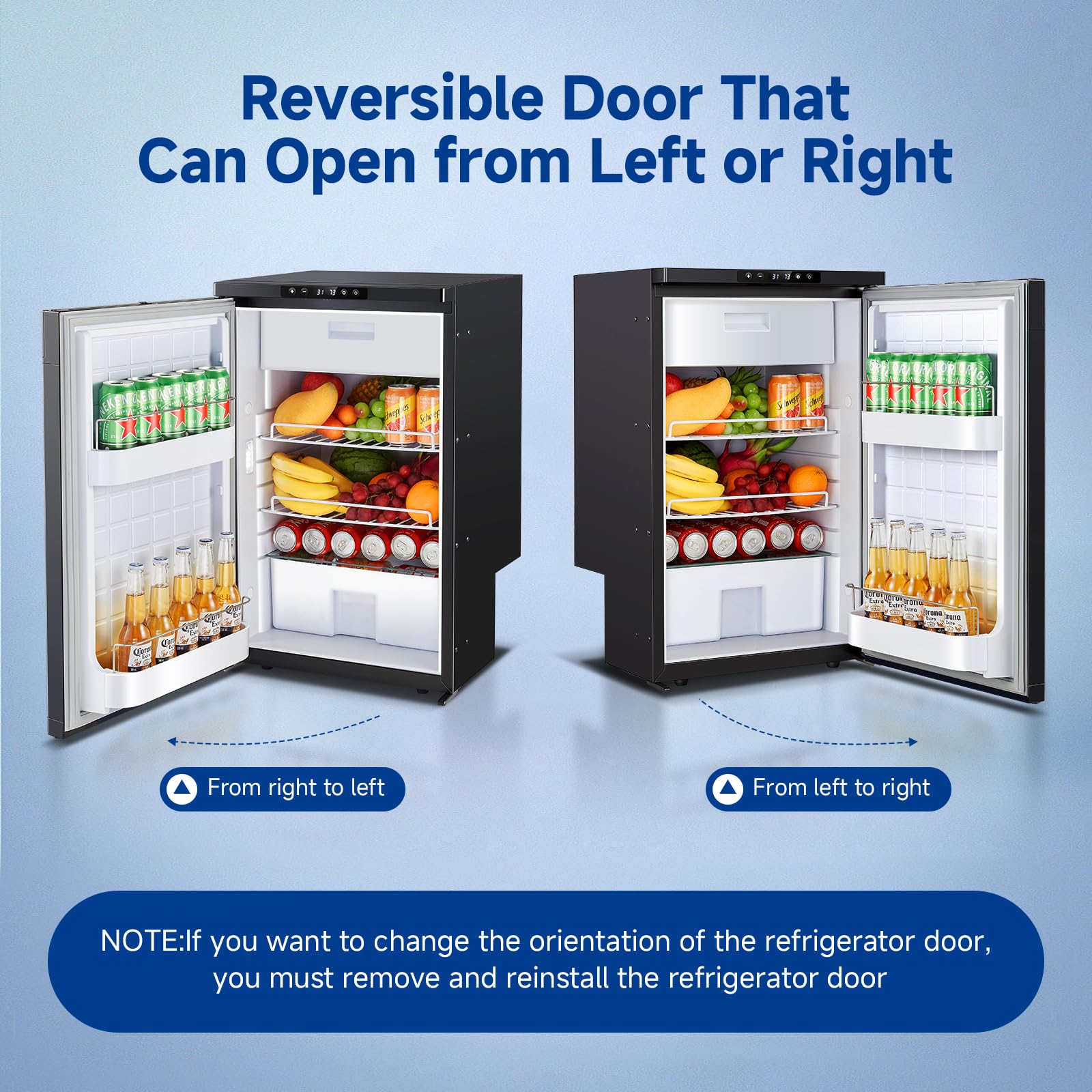 - User Friendly Design: This travel fridge is equipped with a removable crisper drawer, shelf, bottle holder, egg tray. Convenient interior light for easy access in the dark and an easily reversible door that can be opened from the left or right. The 12 volt fridge provides 3 levels (H/M/L) of battery protection to prevent the car power supply from overloading or short-circuiting, so you don’t have to worry about running out of car power during your camping or journey