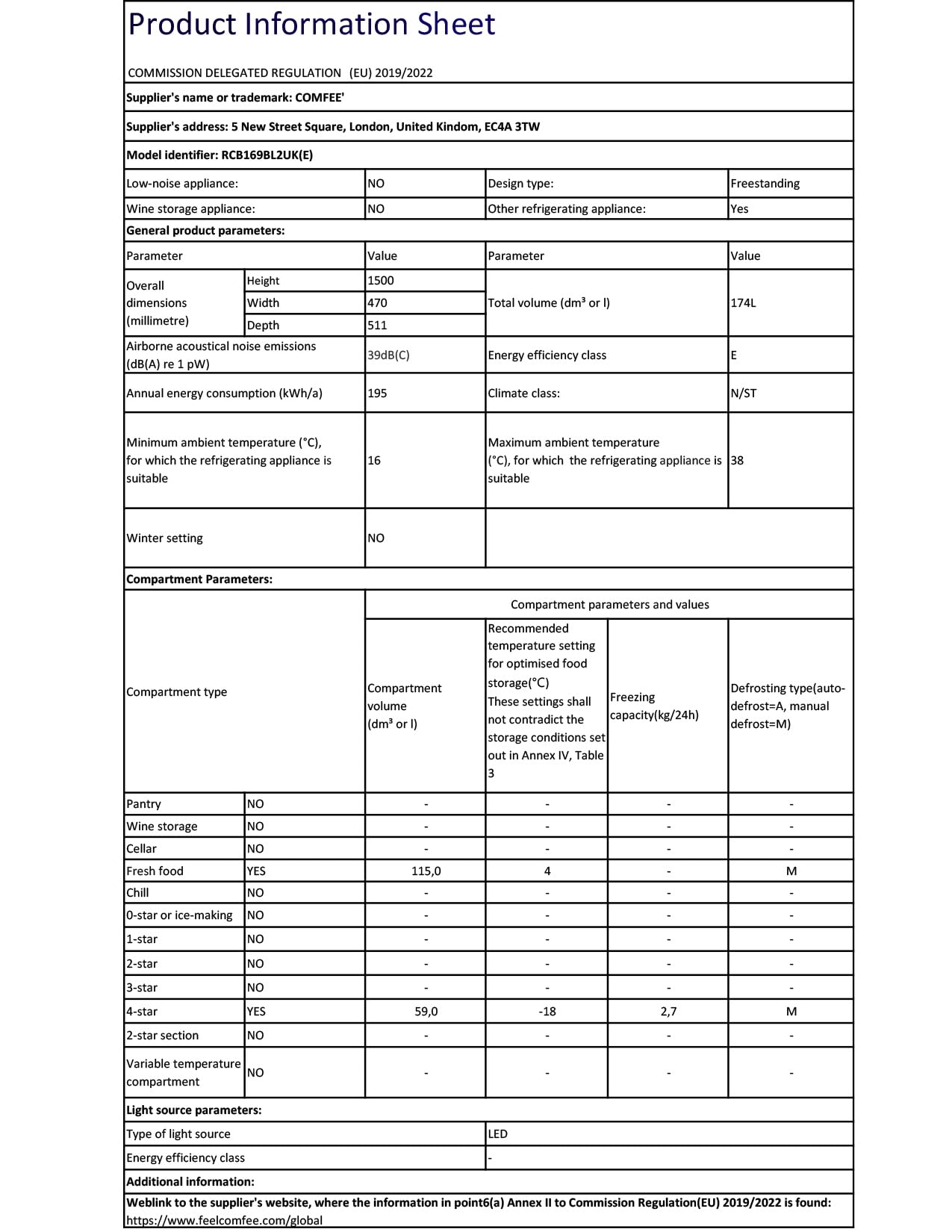 COMFEE' RCB169BL2UK(E) 174 Litre Freestanding Fridge Freezer, Low Frost, Adjustable thermostat, Energy Saving LED lights, Reversible Door Hinge, Low Noise- Black
