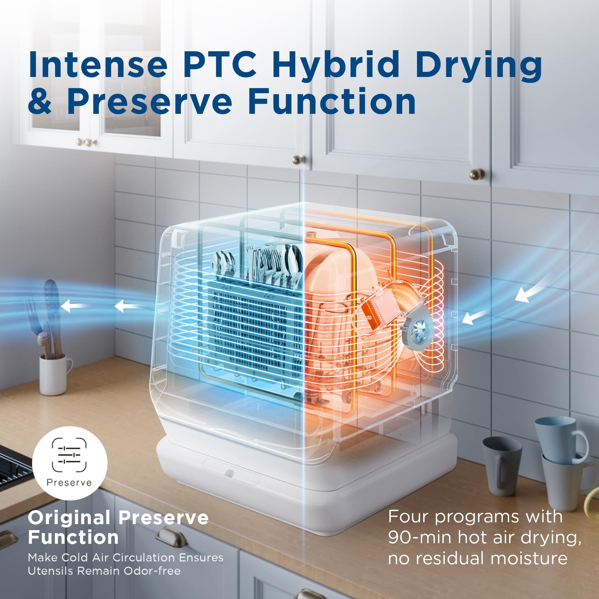 - π Intense Hybrid Drying: In the Intense, Normal, Rapid, and Glass programs, the mini dishwasher activates hot air drying for about 90 minutes, ensuring that all dishes are thoroughly dried with no residual moisture left behind