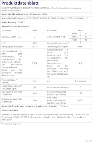 - 【SAVES ENERGY】 HAVA R01 Countertop Dishwasher only consumes 5L of water per wash cycle, only 1/4 the amount used by handwashing, which reduces water consumption by 75%. Operating at 950 W, this appliance is a great energy-saving choice for every family.【NOTE】 Only use dishwasher-specific detergent. Pods, liquids, or powder detergents are all acceptable for use. Add the proper amount of detergent, about 0.2–0.3 oz, to fill the detergent dispenser.